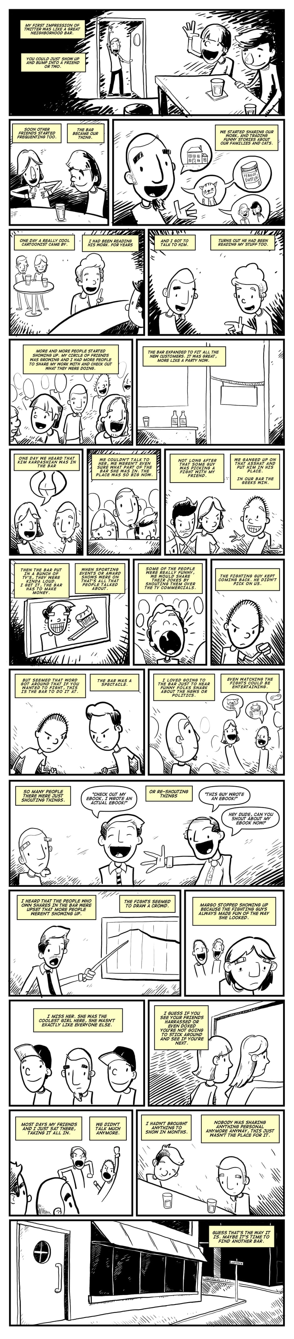 I still come to Twitter, the way you go to a bar you used to love. There’s not as many friends there as there was before, but there are still some. It becomes as much a visit to experience nostalgia as anything else. But then the shouters and the fighters show up and you remember why you lost your interest in it.