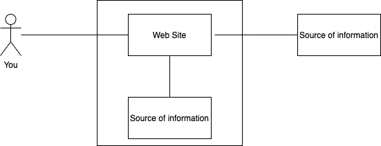 Let’s talk about the diagram above. Websites are made of software running within an environment. (An environment can be a physical computer in a data center, or it could be several computers working together, or even a mainframe. In this diagram it is the box around the web site box). You use an app or your browser to send a request through the Internet to the web site for information. The software that makes up the web site provides you with the information in a response. Sometime the source of information is from the same environment, other times it has to go outside the environment to get the information. For example, you might go to a web site and click on a link to get store hours: that is your request. The website sends a response that is a web page with the store hours. Another time you might send a request to a site to give you all your account information. In that case the web site might go get that source of information from a number of different systems outside the environment and then send you a response with all your account information.