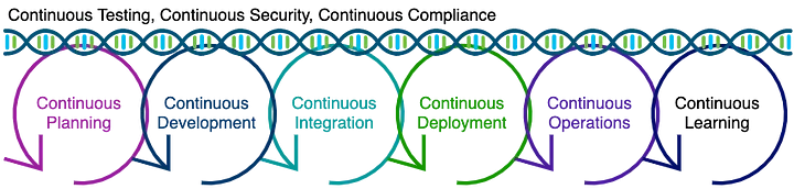 IBM has long put together such good reference architectures. Of all I have seen, this is one of the better ones I have seen: DevOps architecture: Reference diagram – IBM Cloud Architecture Center. It covers all the stages of DevOps, from Planning to Deployment to Learning. It shows the logical parts of the DevOps Architecture and what tools support that. It reveals the relationships between the parts, both static and dynamic. It reminds you of the things you need that you might not be aware of. I think it’s fantastic.